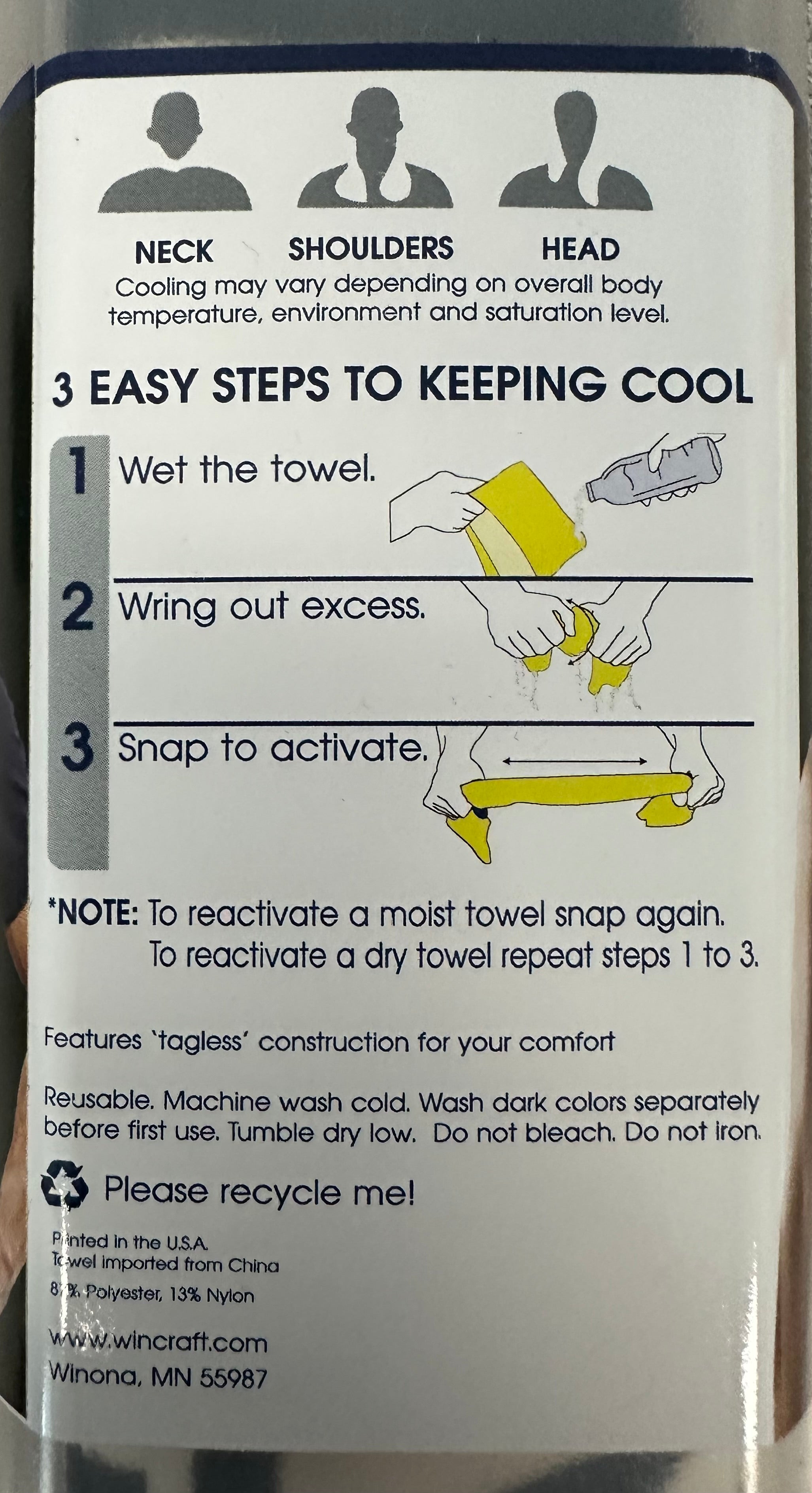 This 12"x 30" cooling towel helps cool the body with just water and a snap of the towel.